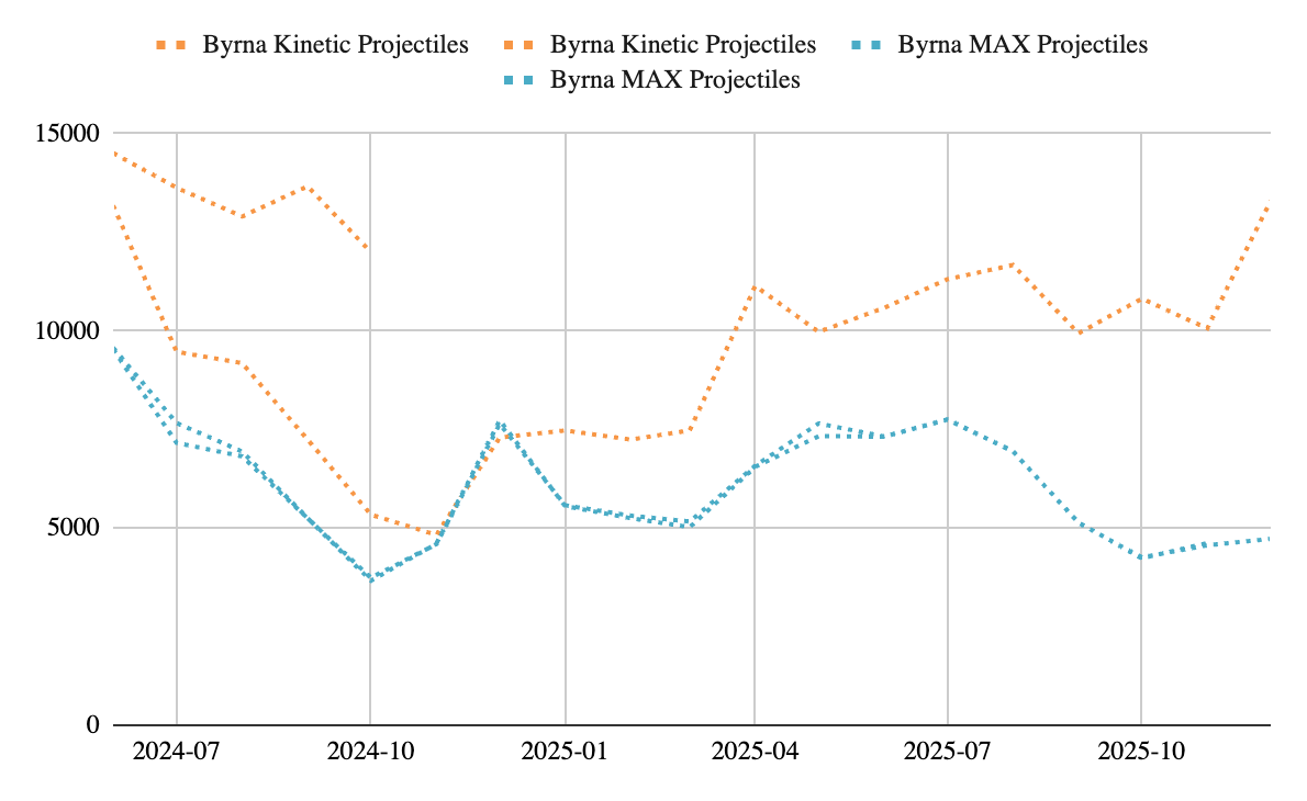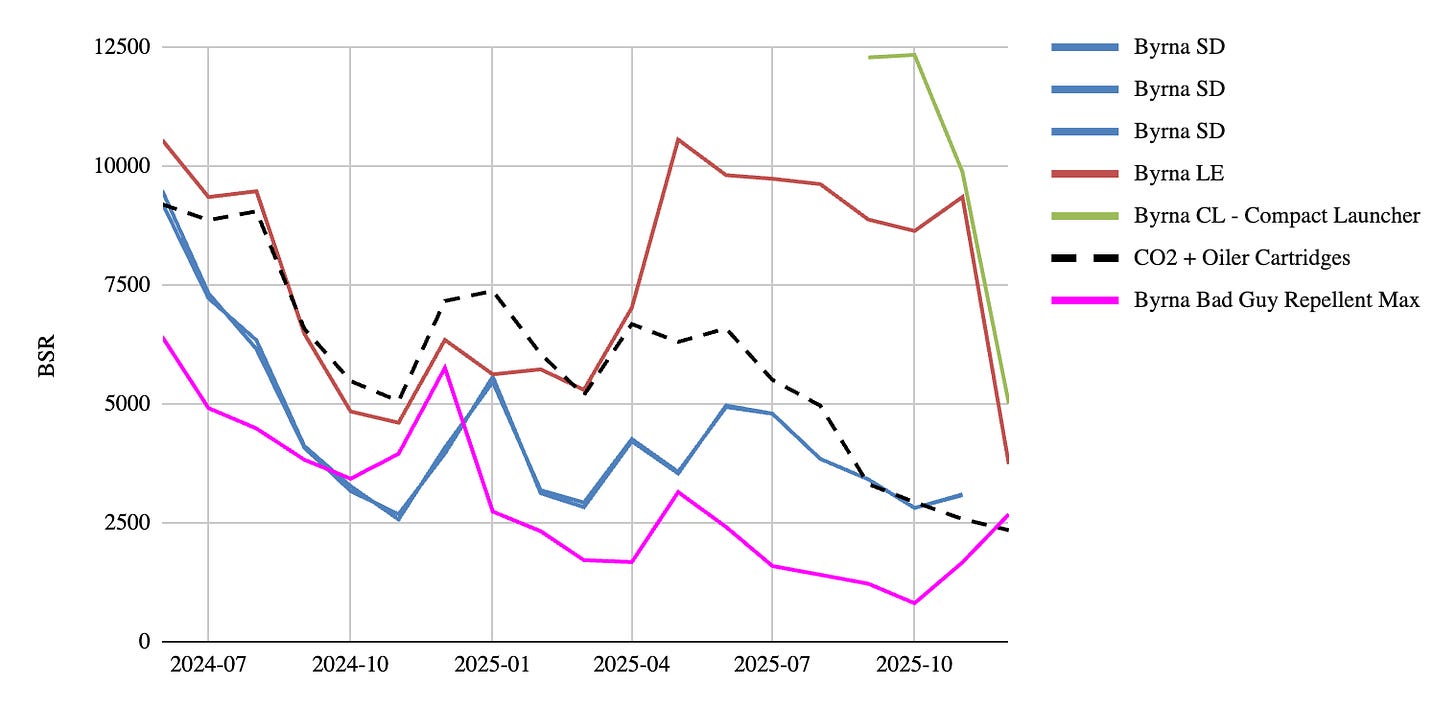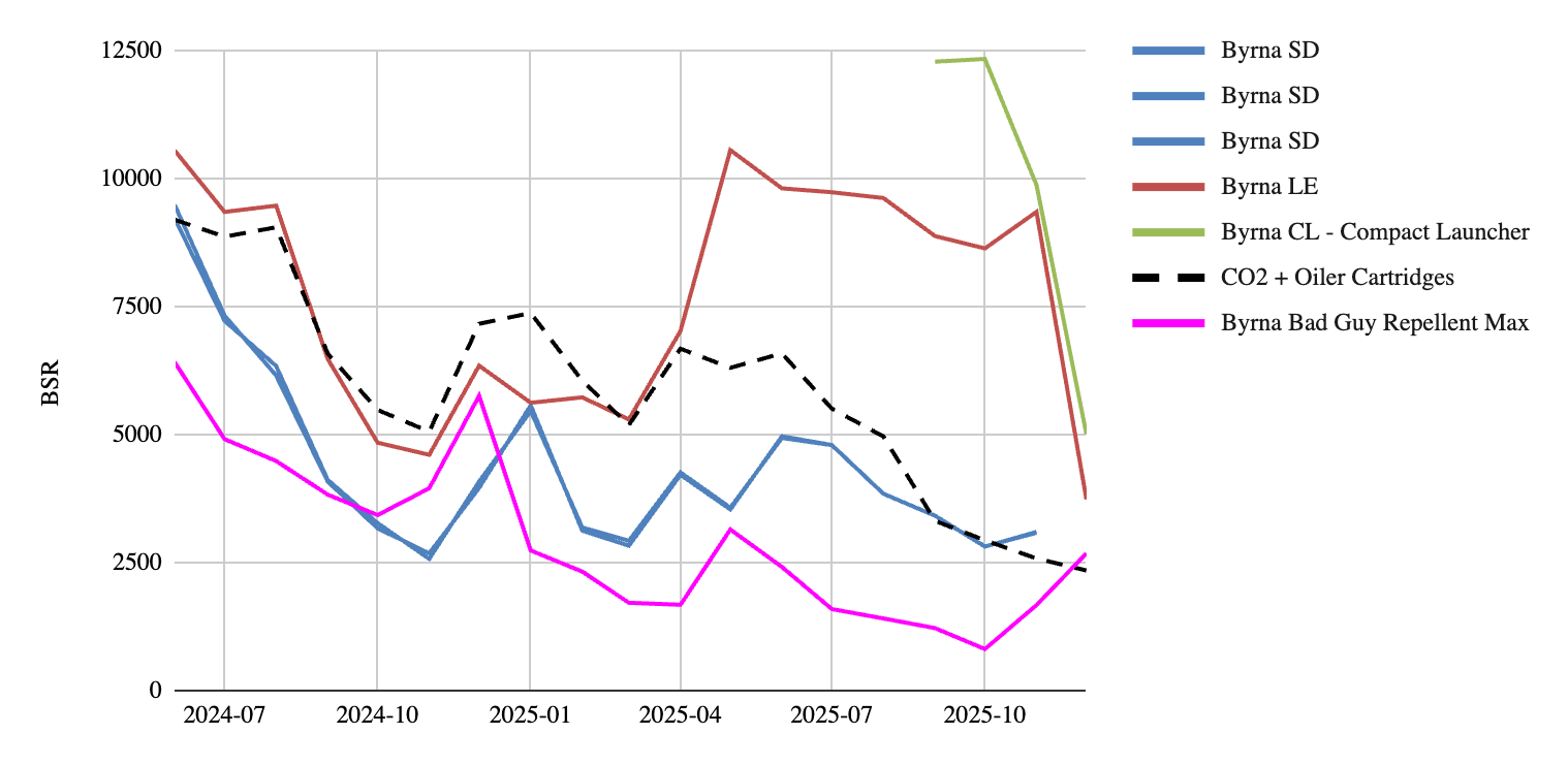This difference may partially reflect real user behavior, as MAX rounds are often preferred for certain use cases, but it may also stem from data-capture limitations or difference in channel mix. Kinetic rounds are sold across multiple SKUs on Amazon, and the dataset may not fully capture all of them, making the trend line more prone to distortion or partial visibility. Moreover, the channel mix for ammo, especially kinetic projectiles, could lean heavier towards the channels outside of Amazon.Given these factors, ammo should be interpreted as partly supporting the bull narrative, but also a reason to still be diligent. The category does not indicate deterioration, but it also does not signal the same consistency or seasonal lift that other Byrna consumables display.