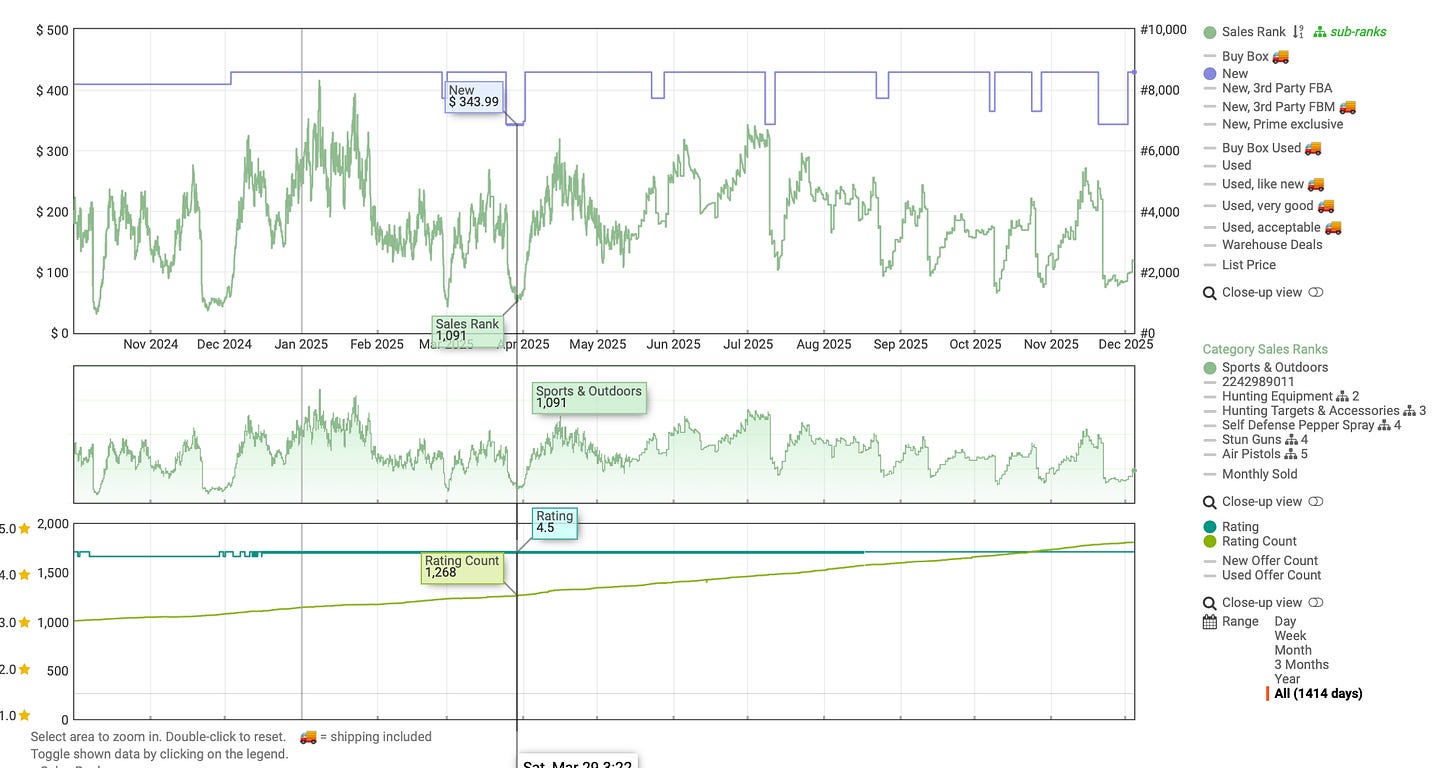 It also competes in a crowded and highly competitive self-defense subcategory on Amazon, with numerous established brands, frequent promotions, and large seasonal influxes of lower-cost alternatives.